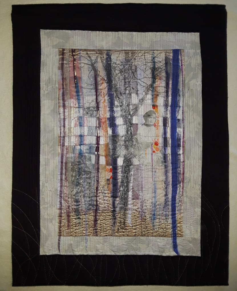 I plan to enter the online gallery at SAQA (Studio Art Quilters Association) this week with this wall hanging. The photo of my great Aunt Esther was printed on organza and layered over woven strips of paper and silk. The printed tree is also on organza with strips of silk and gold foil.
