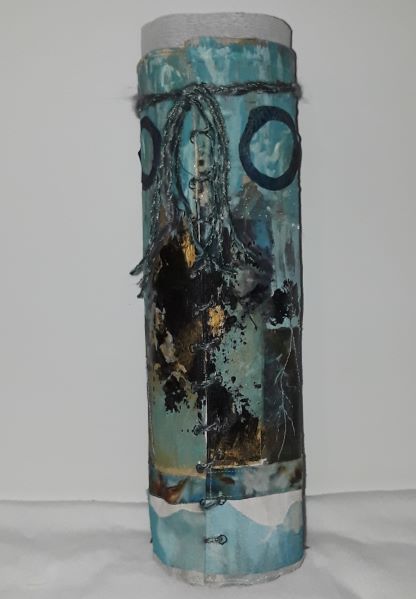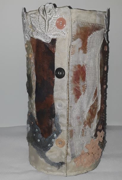 Today I worked on 2 vases that were formerly art quilts. This involved some cutting, stitching and a few additions (embellishments and a bottom to the vase).