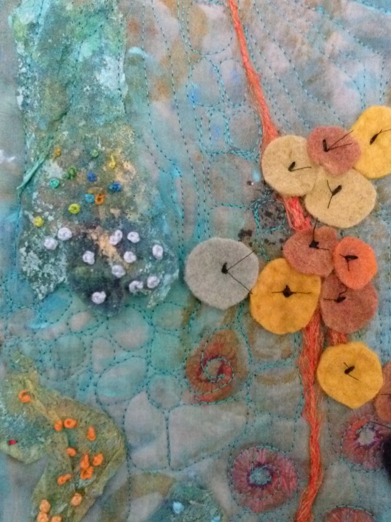 The exhibit called “Vibrant and Bold” will be showing my art quilt during the month of October 2021. My piece is titled “Lichen on Blue”. It includes hand-painted silk, heat-distressed Tyvek, felted wool, silk, hand painted cotton and yarn with hand stitches and machine quilting. I am excited because it is only my second lichen piece to be selected to be exhibited. I have a series of lichen quilts. Below is a detail of some hand stitching with French knots and the felted wool on this quilt.