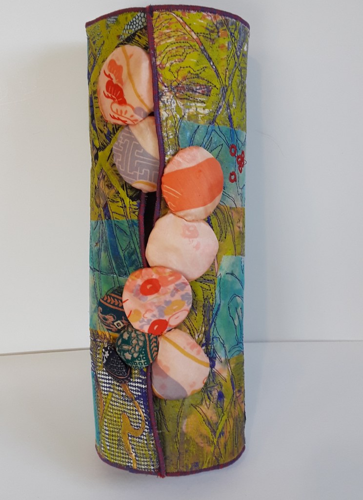 I have completed an impossible seed pod! See below for photo. I first created a small quilt that was collaged and mono-printed, then stitched, quilted and finished the edges with satin stitch. All the results of taking a workshop by Sue Brenner. I was very happy with it and then decided to add “pish dots” made with vintage kimono silk. These were sewn or glued on attempting to make it look like seeds were emerging from the “pod”. #impossibleseedpod, #naturesartinstitch, #naturesartmotes