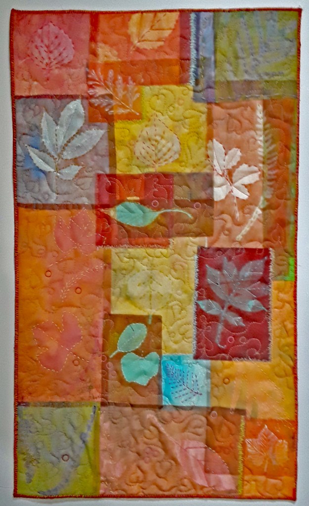 Below is “Leaves Apparent” also submitted to the Elements exhibit. These leaves were gelli plate printed on organza, collaged and fused. Added were hand stitching and machine quilting.