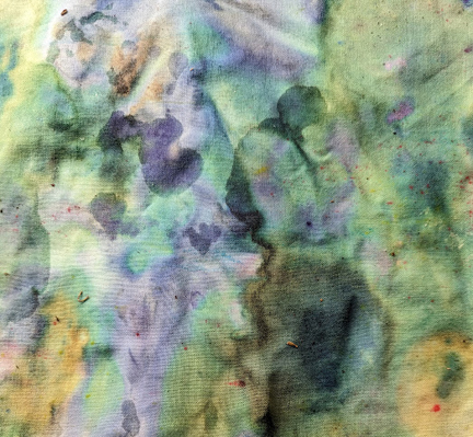 I had the opportunity to cut the blooms from my neighbor’s iris patch, so once they finished blooming, I placed them on some PFD (prepared for dyeing) fabric, pounded them, squished them into the fabric, rolled them up and left them overnight. See the results below.