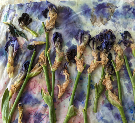 I really did not expect to get a lot of green from the stems, but they also helped create a lovely dyed piece. Love those iris!