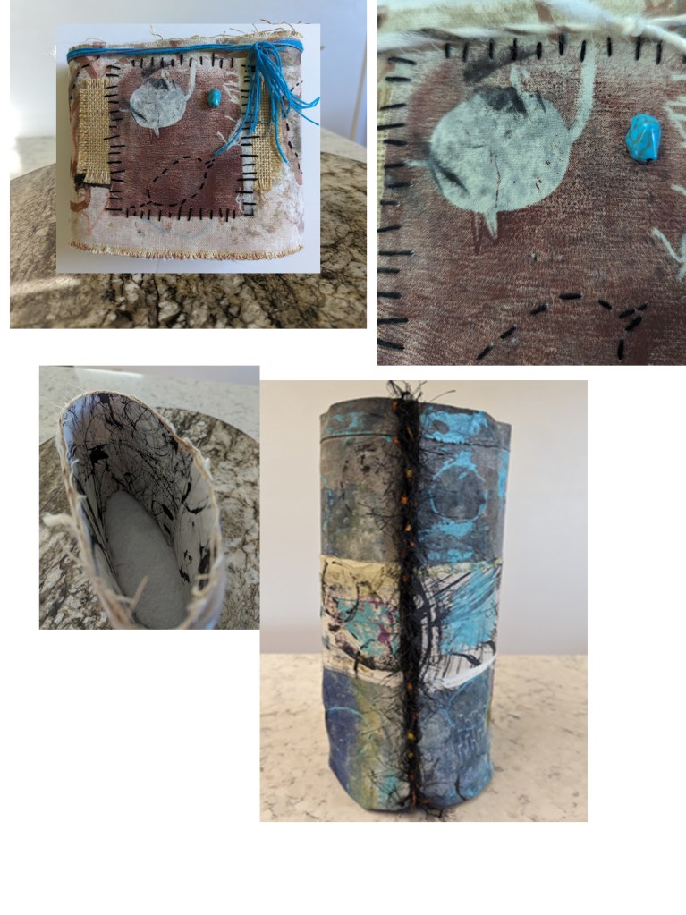 I have made an oval shaped vessel with painted canvas and organza layered with a sun-print and burlap. Embellishments include a “turquoise” bead and thread. The interior lining is white fabric with black marks made with my handmade brushes. See below another cylinder type vessel of painted linen and a paper and cloth “scroll” placed around the middle.