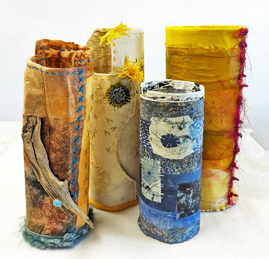 4 New Vases created in an online class titled “Perfectly Imperfect”. First one on the left is “High Desert” vase, next is “Heat Pressed” on canvas, the blue one is “Momigami” vase and the last one is “Silk with Fun Yarn”. These will appear in a book published by Fiber Arts Take Two, titled “Breaking Barriers”.