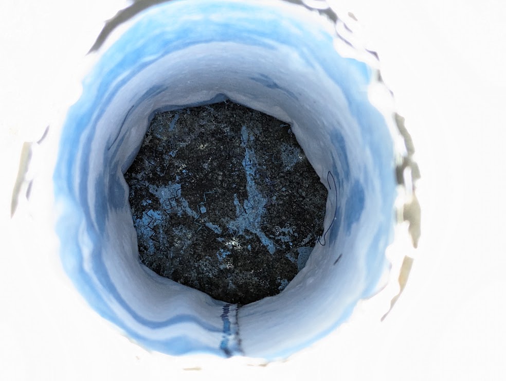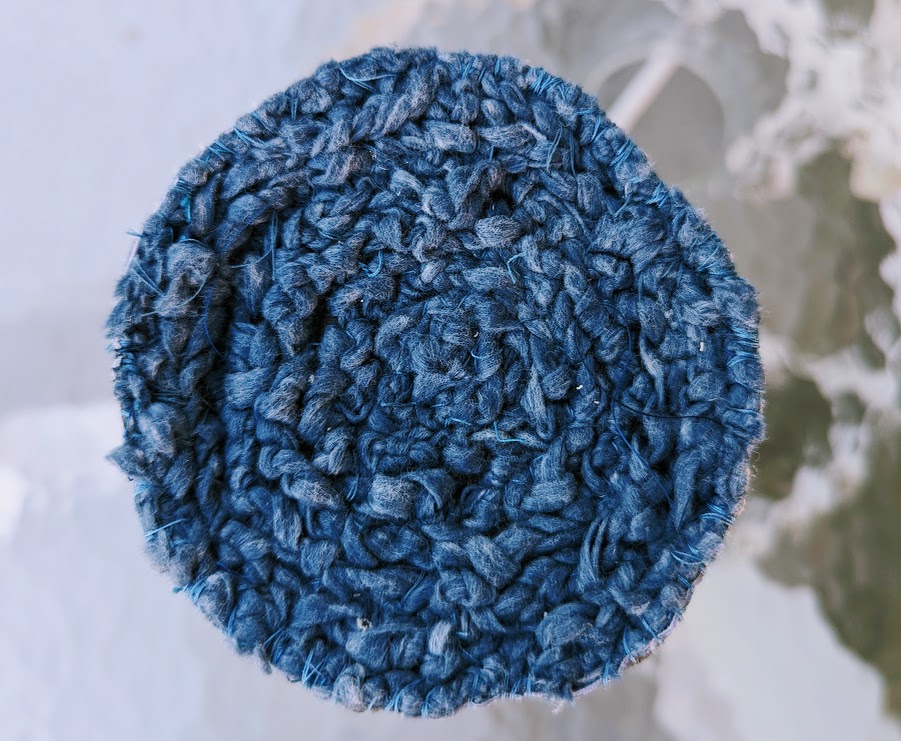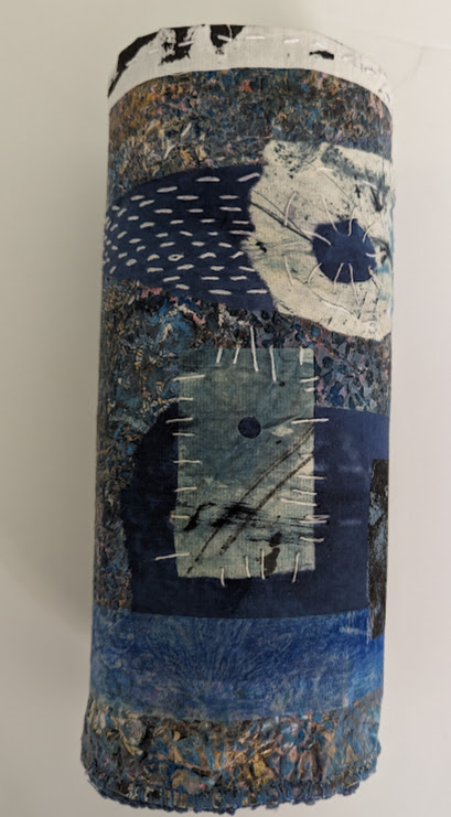 Below is a vessel created with wrapping paper that is crumbled and then painted, plus some indigo dyed paper and hand stitches. The image to the right of the vessel is the interior of the vase. This was formed into a cylinder and a coiled base hand sewn to the bottom made with paper yarn. It is about 12 inches tall and about 5″ deep.