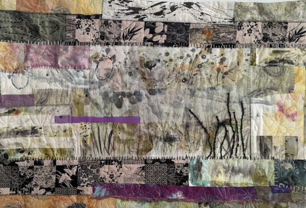 This wall quilt measures 27″ W x 19″ L and includes hand painted fabric, stamps, dryer sheets and organza overlays. I have hand stitched throughout and then machine quilted the final details. There is some commercial fabric I unearthed in my stash from several years ago. It is seen here as the black and white strips with an Asian flair toward the top and bottom of the quilt.