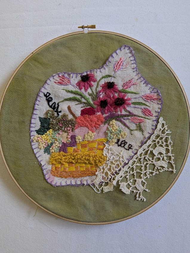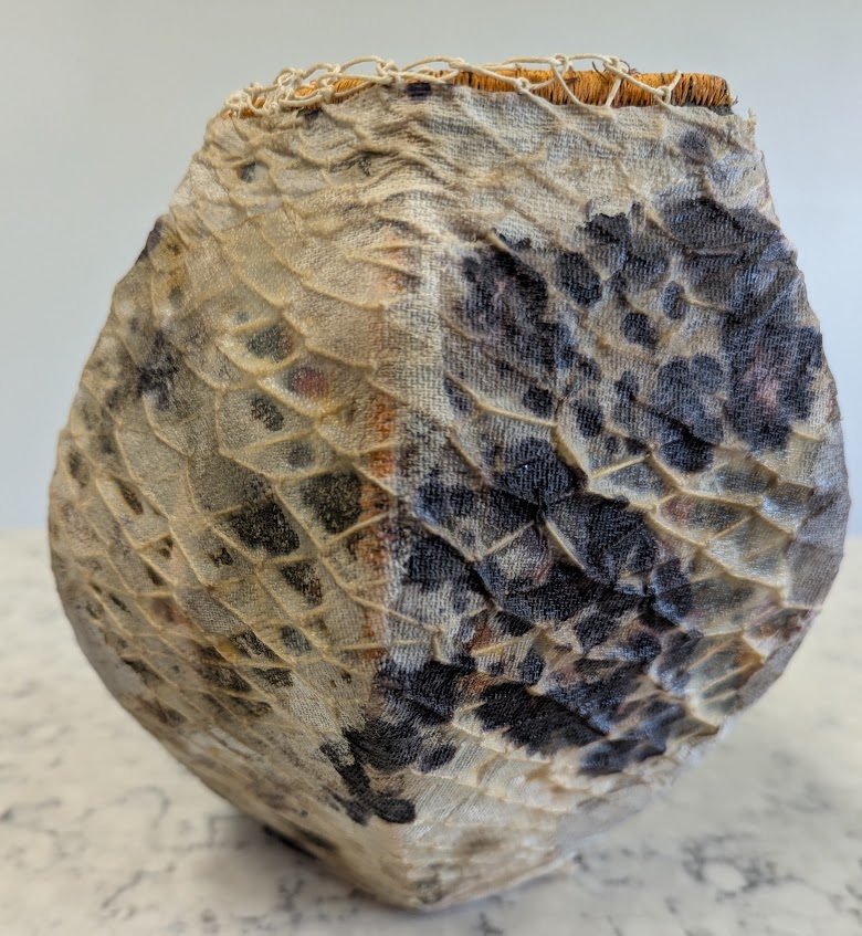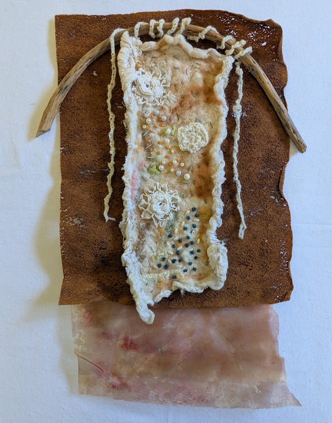 The Wayward Coil was created 2 years ago and now I have added ginko leaves made with copper wire and mulberry paper. I started with a “Y” shaped branch and added vintage crochet and coiling. The title tells the story of the coiling which took it’s own path and I let it go that way!